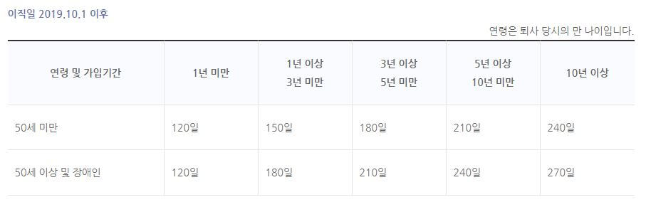 근로자의 연령과 보험 가입 기간에 따라 다릅니다. 지급기간은 50세 미만과 50세 이상 및 장애인으로 나뉘게 됩니다. 또한 고용보험 가입기간에 따라 세부적으로 나뉘게 됩니다. 기간은 1년 미만, 1년~3년 미만, 3년~5년 미만, 5년~10년 미만, 10년 이상으로 구분되고 기간에 따라 지급일수 또한 다르게 되어있습니다.